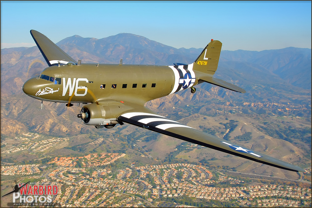 Air to Air shoot with Lyon Air Museum's Douglas C-47B Skytrain 'Willa Dean' and a Cessna O-1E Bird Dog photographed from a North American T-6G Texan/Harvard II over Orange County, California.